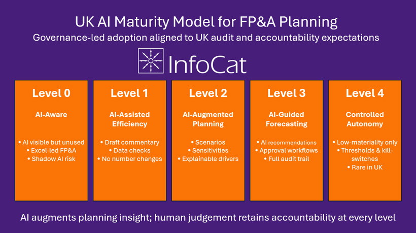 For UK CFOs and FP&A leaders, maturity is not measured by how much AI is deployed, but by how confidently it can be defended.
